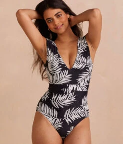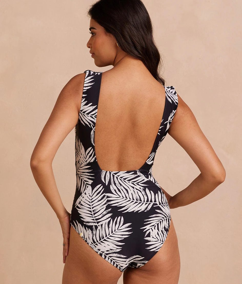 A deep vee front, a stunning open back, and flirty ruffles—this suit has it all. Our signature compression keeps you feeling secure (no tugging or adjusting), and the architectural details make a statement from every angle. Get out there and get ready to turn some heads.Â