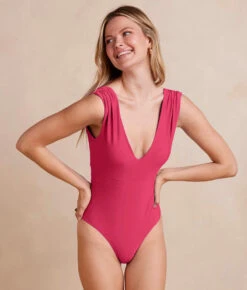 A deep vee front, a stunning open back, and flirty ruffles—this suit has it all. Our signature compression keeps you feeling secure (no tugging or adjusting), and the architectural details make a statement from every angle. Get out there and get ready to turn some heads.Â