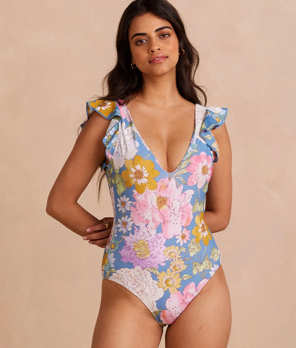 A deep vee front, a stunning open back, and flirty ruffles—this suit has it all. Our signature compression keeps you feeling secure (no tugging or adjusting), and the architectural details make a statement from every angle. Get out there and get ready to turn some heads.Â